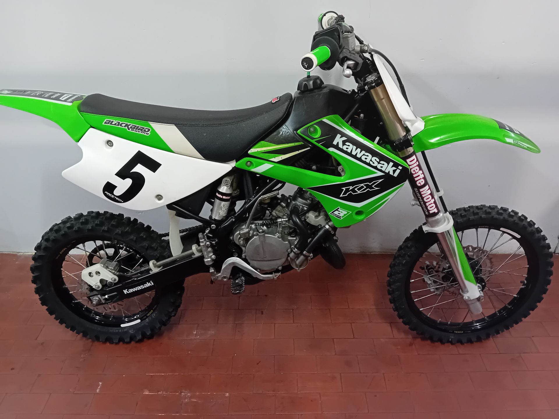 Moto da cross usata Kawasaki KX 85cc, competizione, restaurata, motore da rodaggio, cerchi e gomme nuovi. Anno 2005.